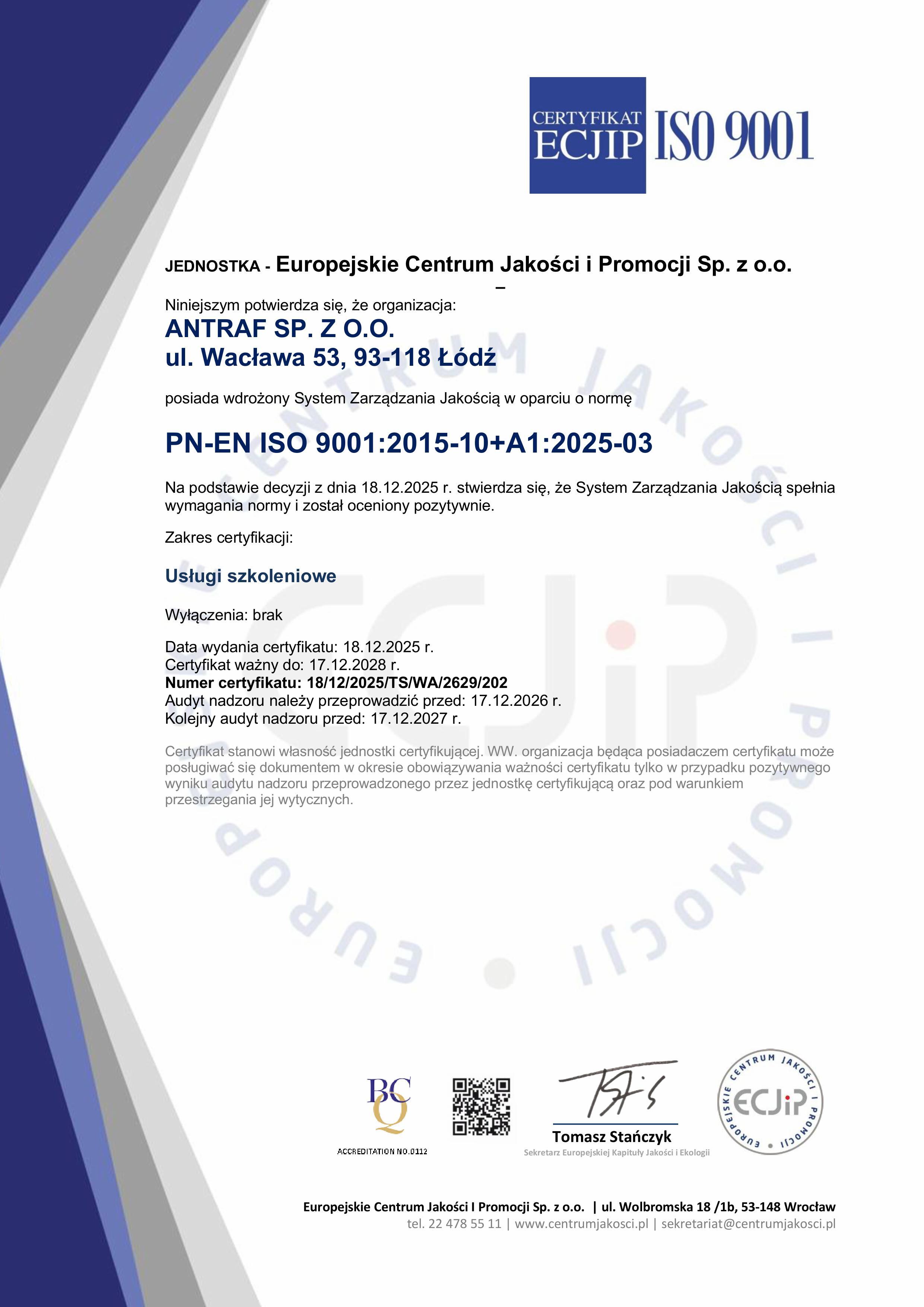 Certyfikat ISO 9001 to gwarancja, że szkolenia prowadzone są według jasno określonych standardów jakości, z dbałością o każdy etap procesu edukacyjnego. Dla kursanta oznacza to uporządkowany program, spójne metody nauczania oraz pewność, że zdobywana wiedza jest przekazywana w sposób przemyślany i konsekwentny.